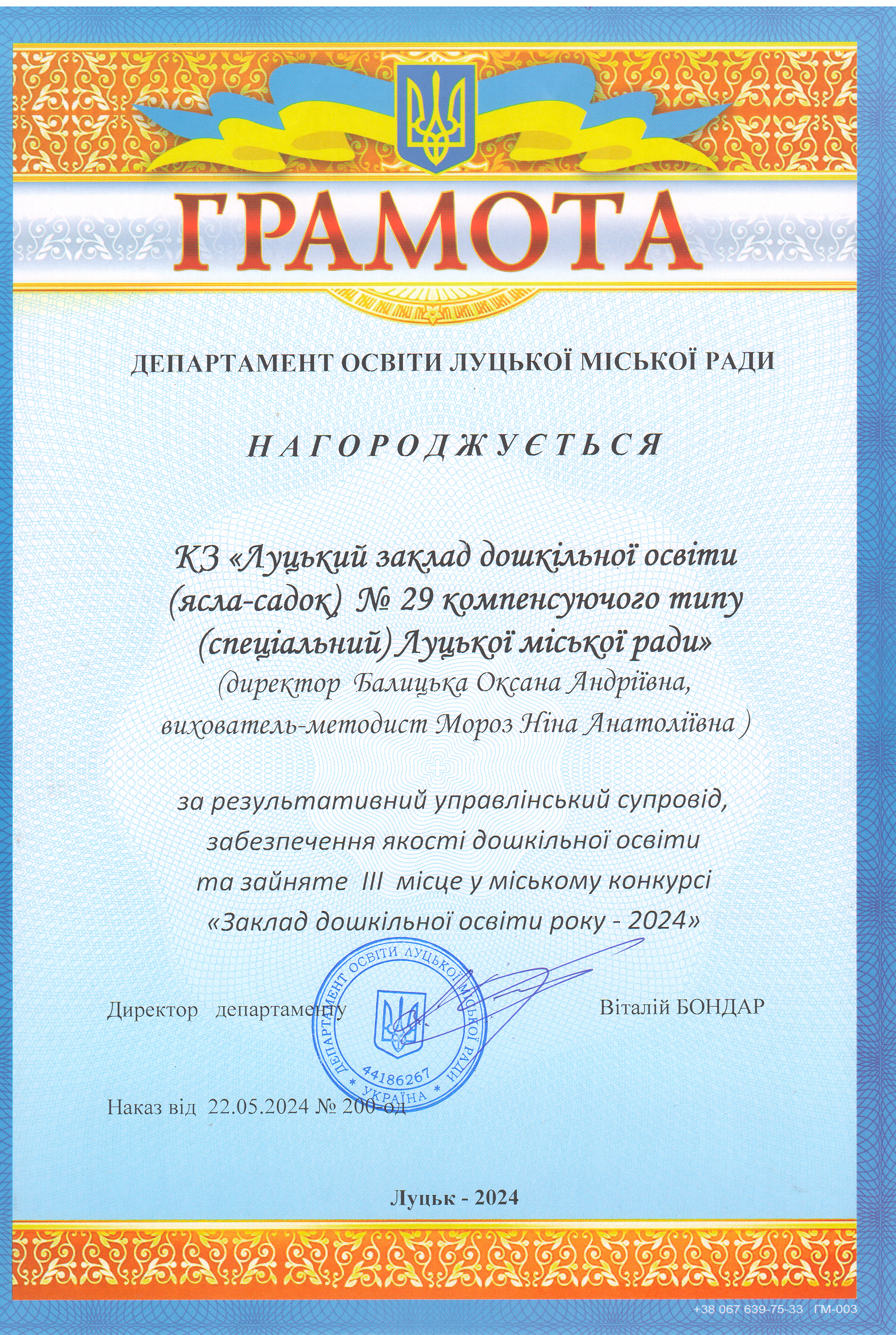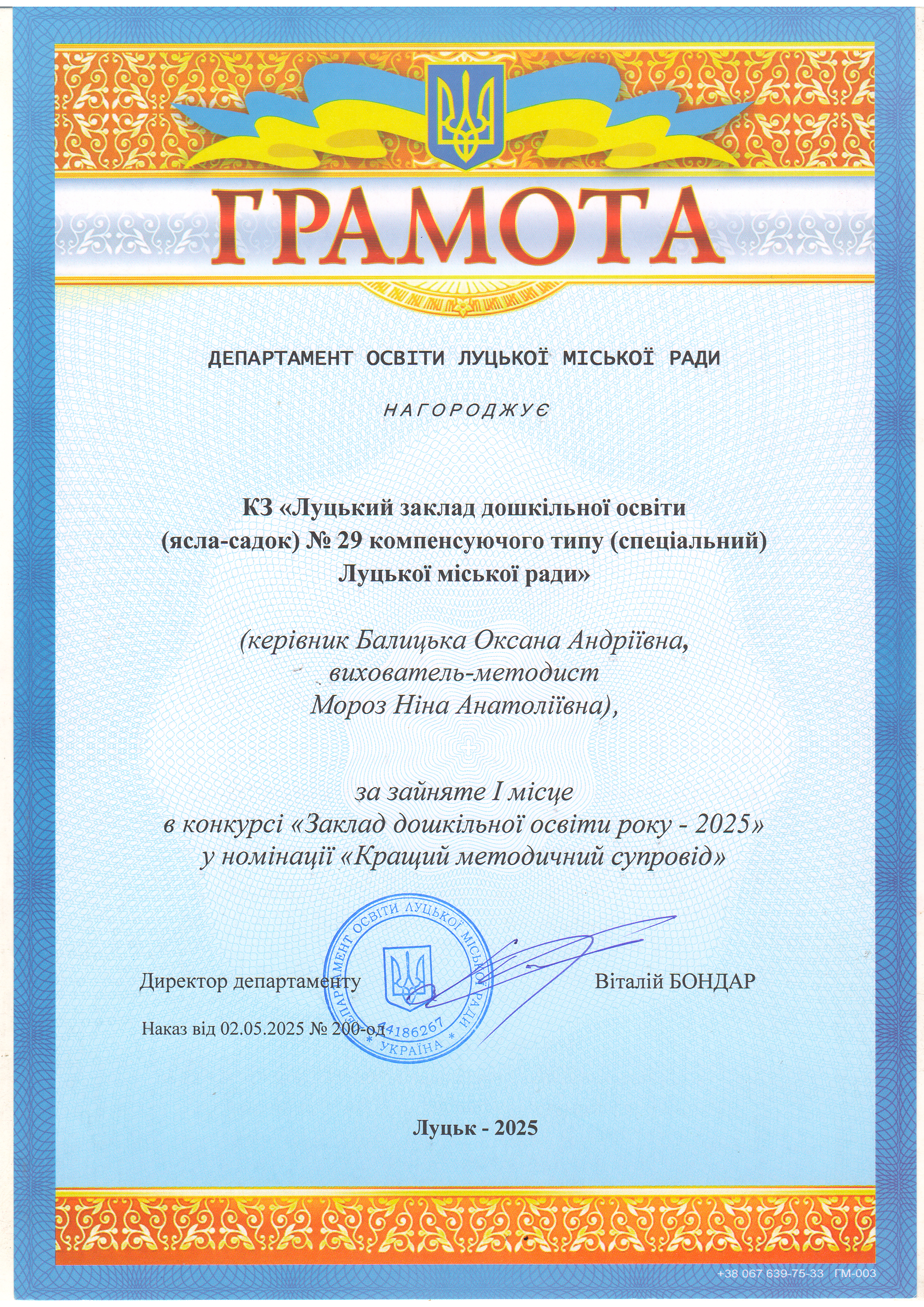 Методичні рекомендації «Дошкільне дитинство - початковий етап неперервної валеологічної освіти. Управлінсько-методичні рекомендації» (директор О.А. Балицька, вихователь-методист Н.А. Мороз) отримали диплом ІІ ступеня номінації управління освіти та науки Волинської обласної державної адміністрації.
