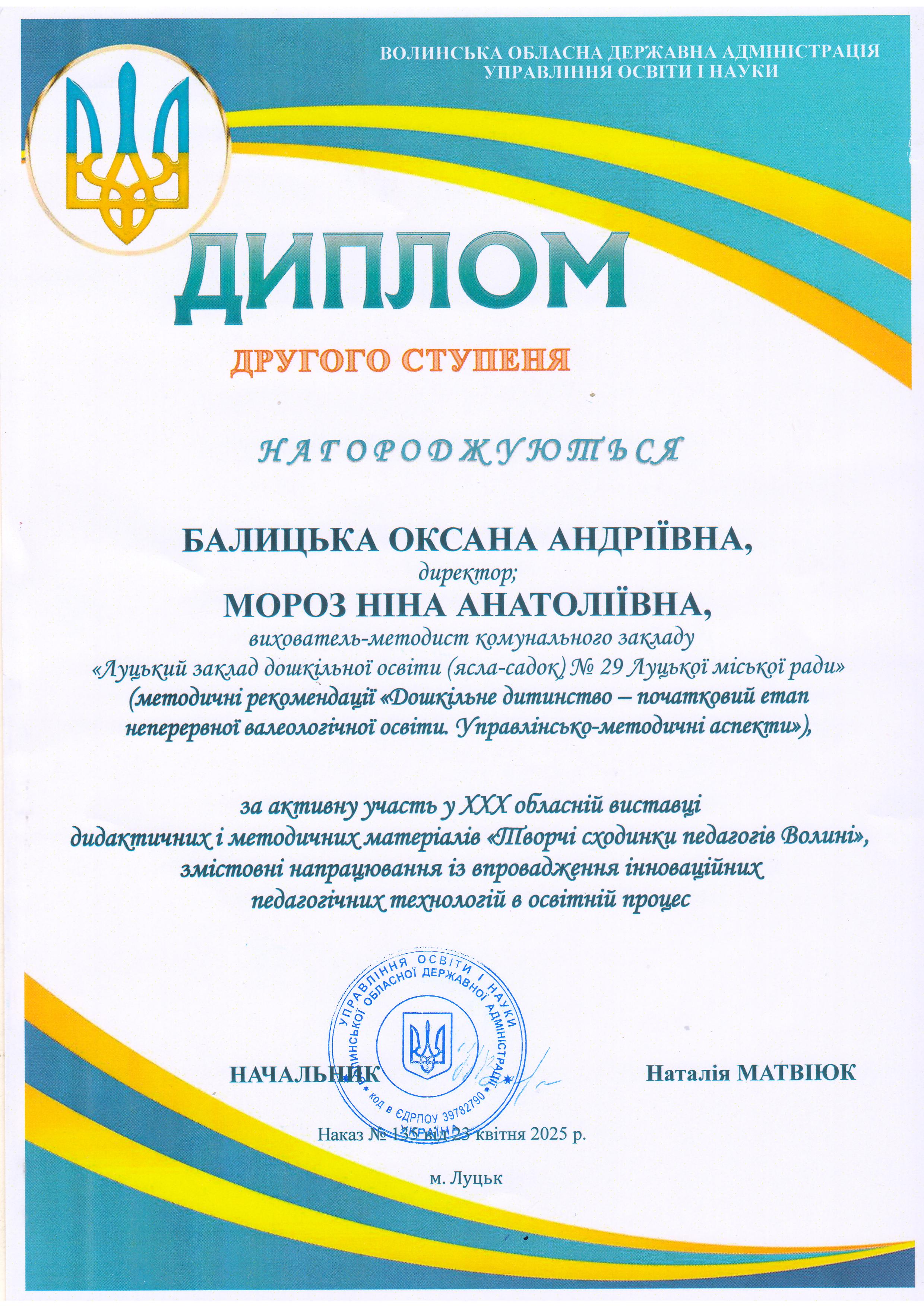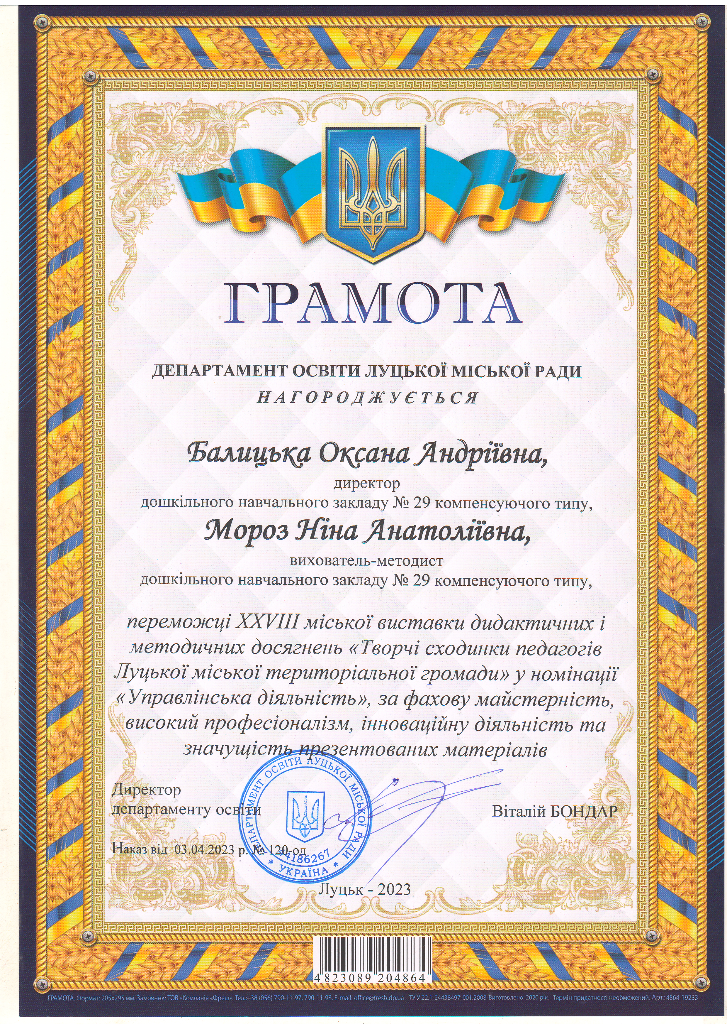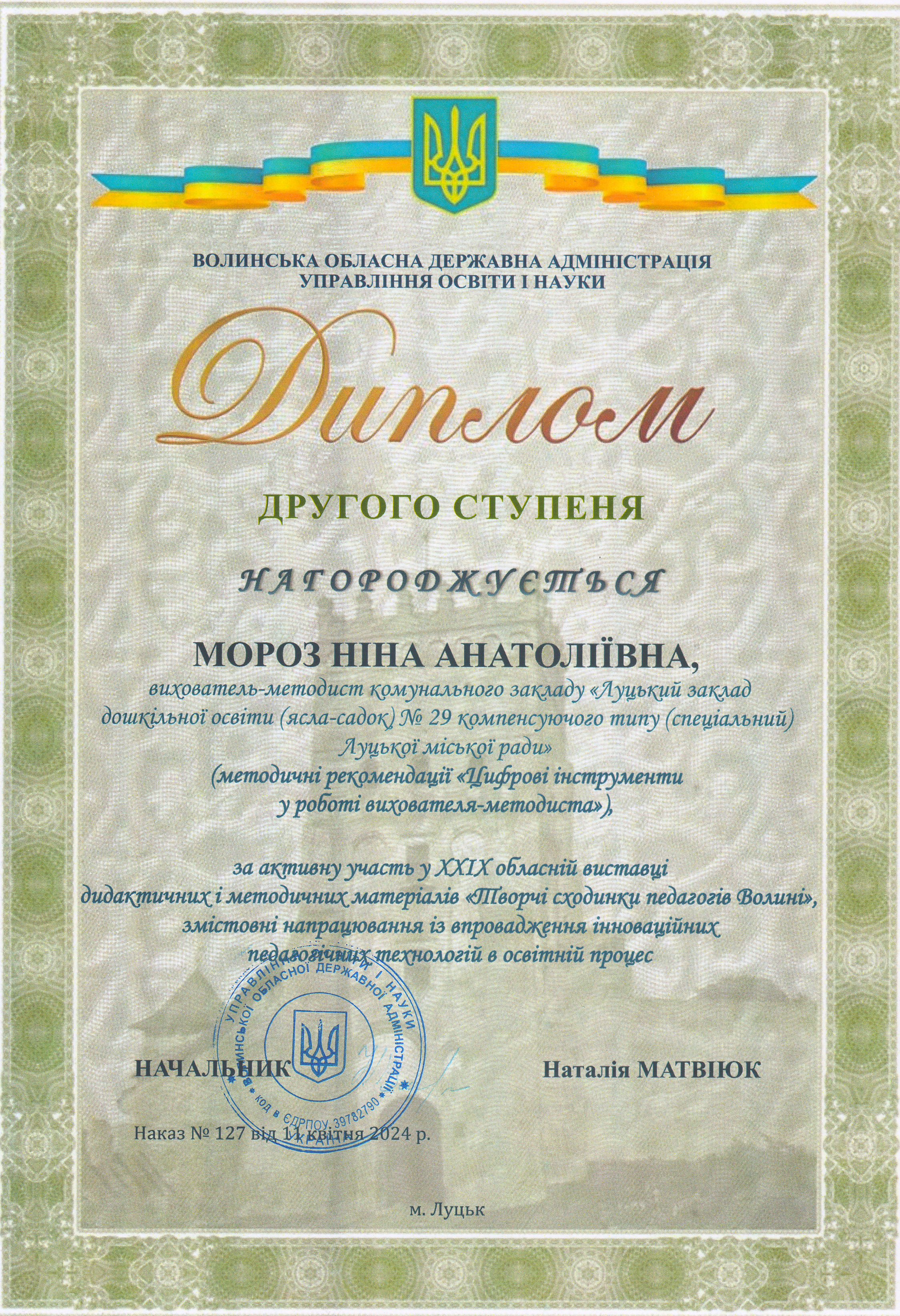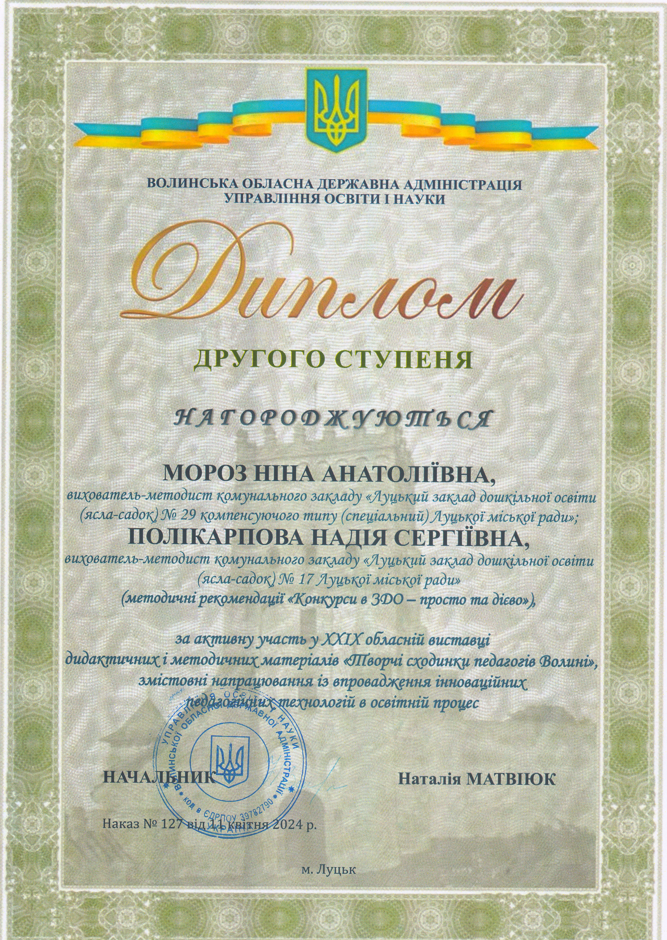Методичні рекомендації «Цифрові інструменти у роботі вихователя-методиста» (автори-укладачі – Ніна Мороз), методичні рекомендації «Конкурси в ЗДО - просто та дієво» (автори-укладачі – Ніна Мороз, вихователь-методист ЗДО №29, Надія Полікарпова, вихователь-методист ЗДО №17) отримали дипломи ІІ ступеня управління освіти та науки Волинської обласної державної адміністрації.