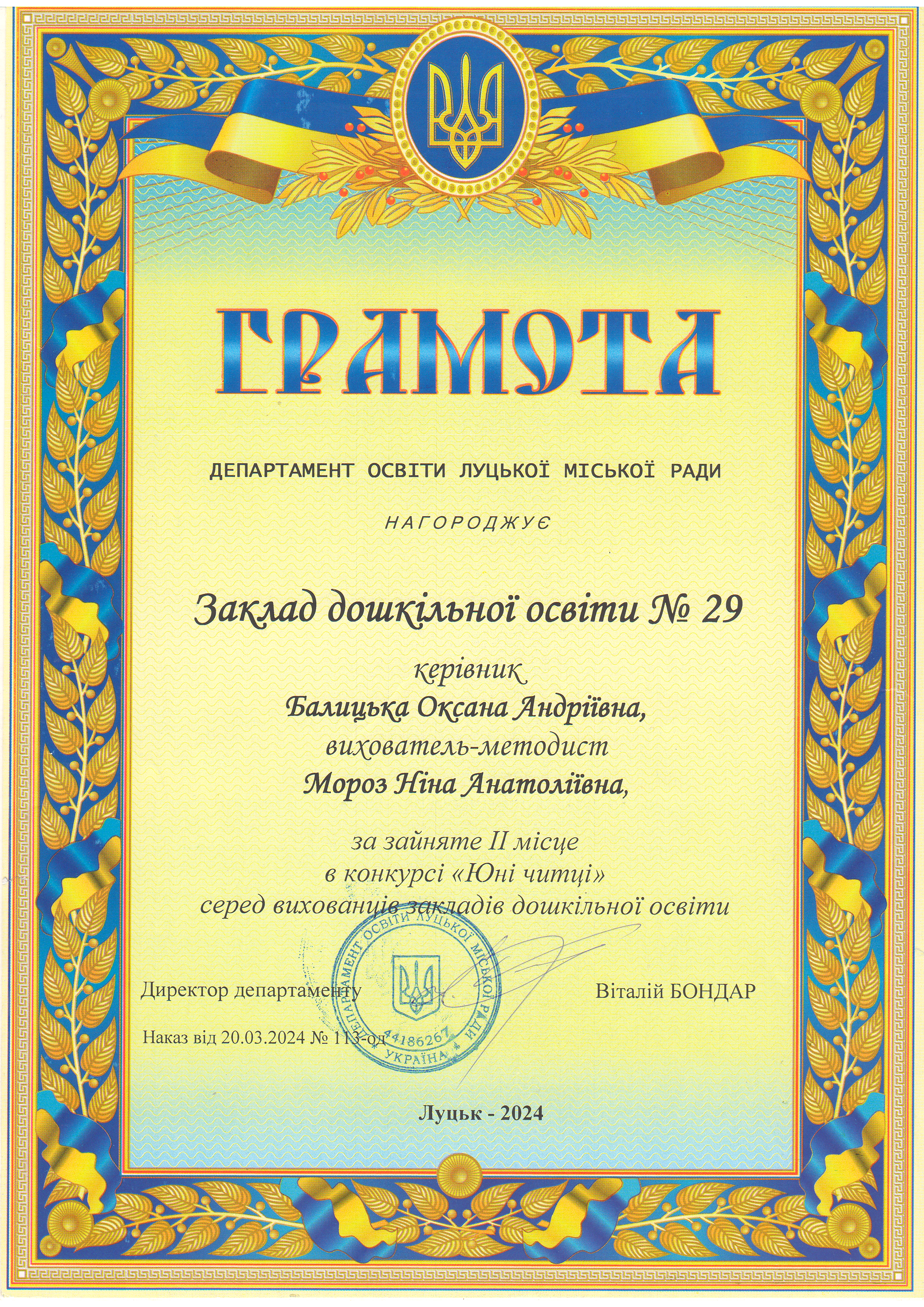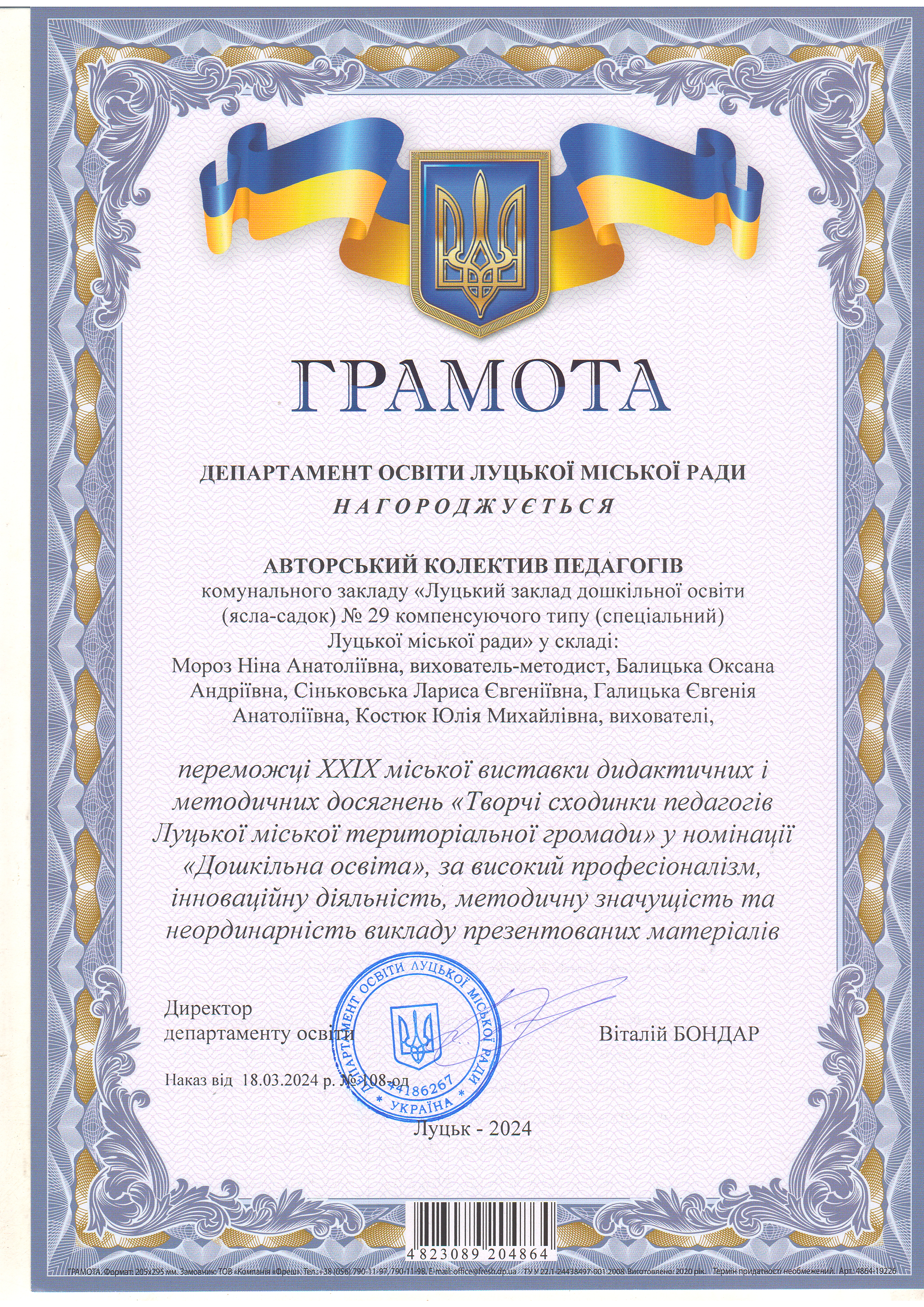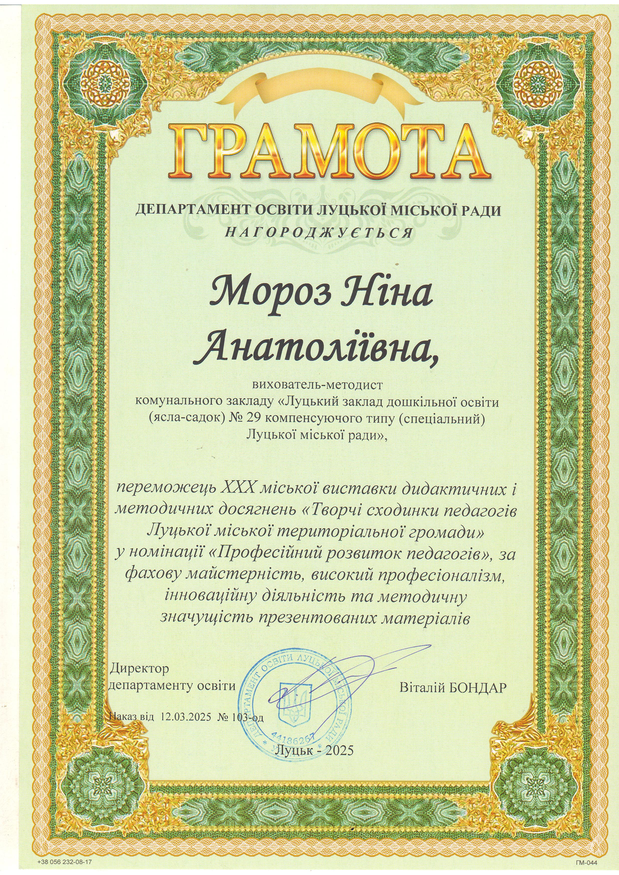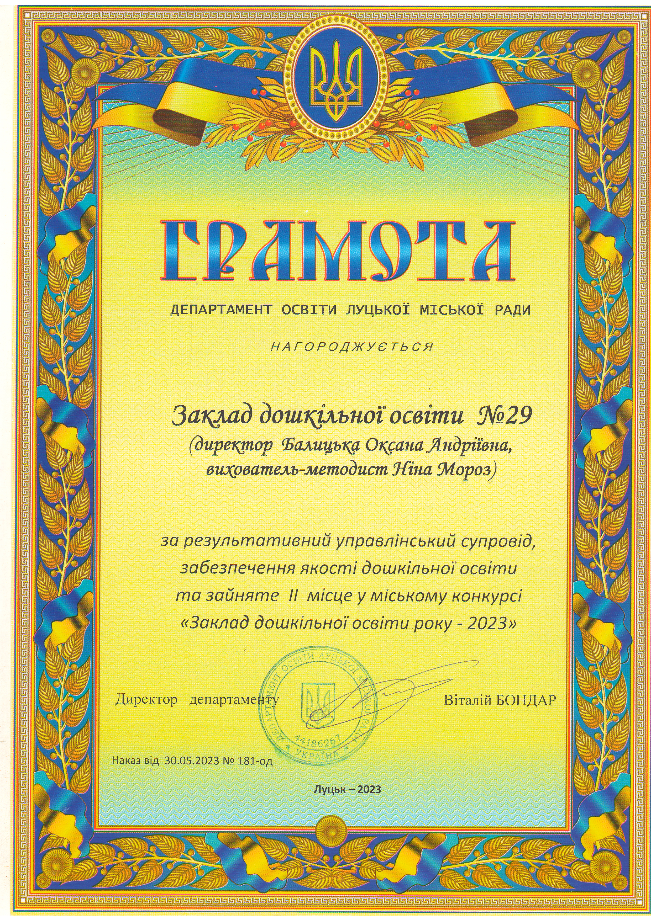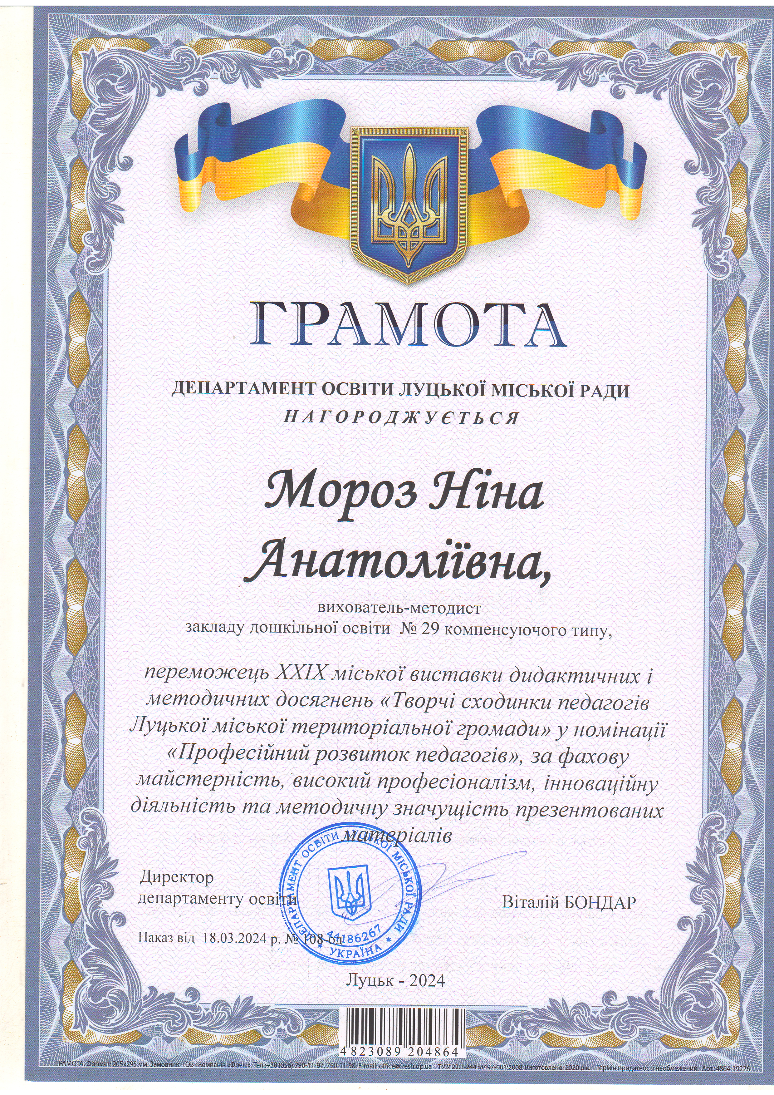 Методичні рекомендації «Цифрові інструменти у роботі вихователя-методиста» (автори-укладачі – Ніна Мороз), методичні рекомендації «Конкурси в ЗДО - просто та дієво» (автори-укладачі – Ніна Мороз, вихователь-методист ЗДО №29, Надія Полікарпова, вихователь-методист ЗДО №17) отримали дипломи ІІ ступеня управління освіти та науки Волинської обласної державної адміністрації.