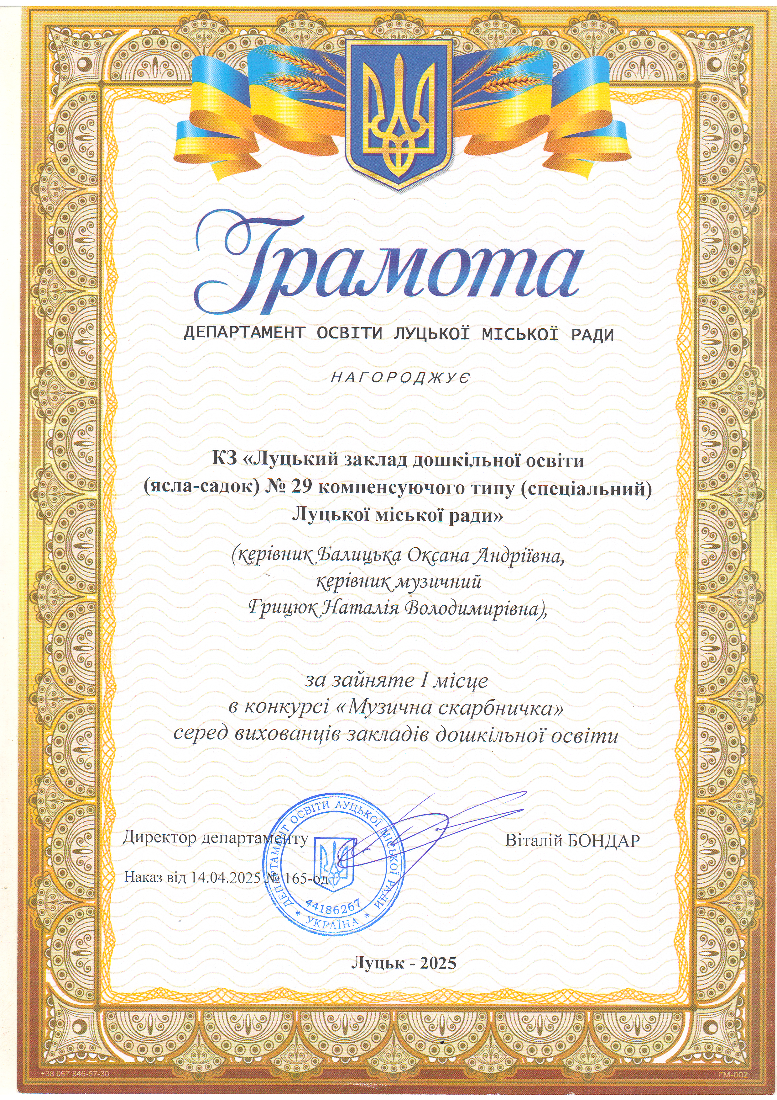 Перше місце у конкурсі "Музична скарбничка" серед вихованців ЗДО