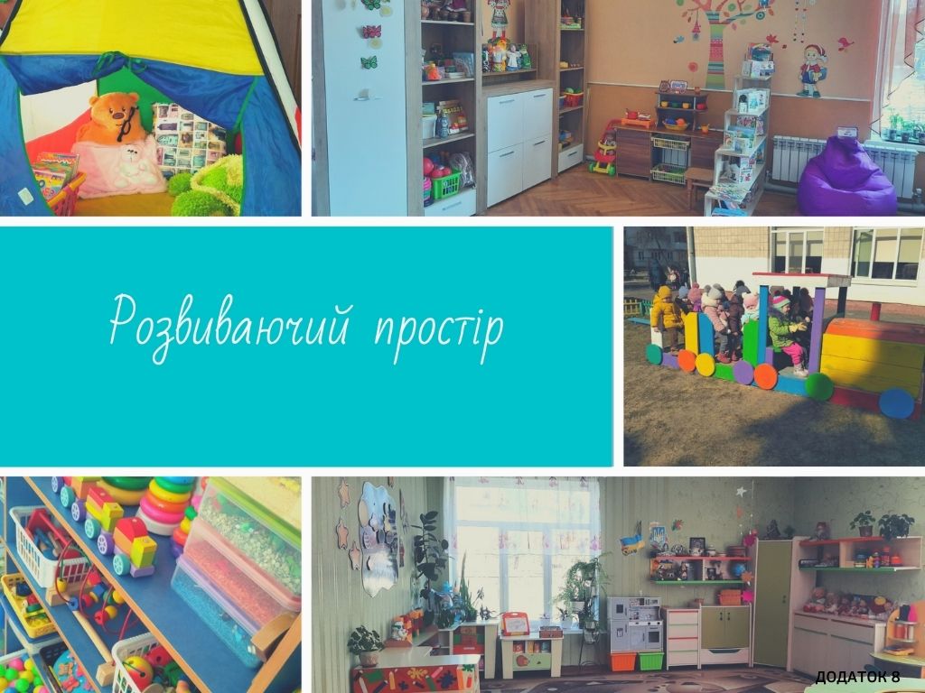 У групах створено різноманітні осередки: ігровий, здоров’язбережувальний, мистецький, читацький, сенсорно-когнітивний, етнографічний, еколого-природничий, трудовий, технічний. У ЗДО вихователі самі визначає кількість осередків, їх розміщення та обладнання. Це залежить від площі групового приміщення, потреб та інтересів дітей, їх уподобань. Тематичний формат, наповнення й розташування осередків відповідає віку, потребам, інтересам та ініціативі дітей. Матеріали діти можуть переміщувати від одного осередку до іншого. Просторове розміщення й вміст осередків сприяє співтворчості та спілкування однолітків між собою і з дорослим. У групах наявні місць для відпочинку та усамітнення дітей.