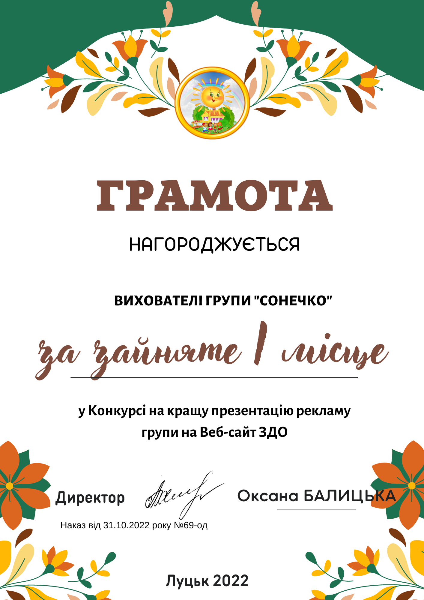 І місце - групи «Сонечко» (вихователі О.Д. Теліженко, Н.М. Місіюк) та «Зернятко» (вихователі Л.В. Ткачук, Ю.М. Костюк);